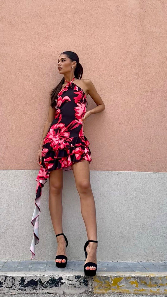 Abito in lycra con scollatura all’americana, orlo asimmetrico arricchito da rouches