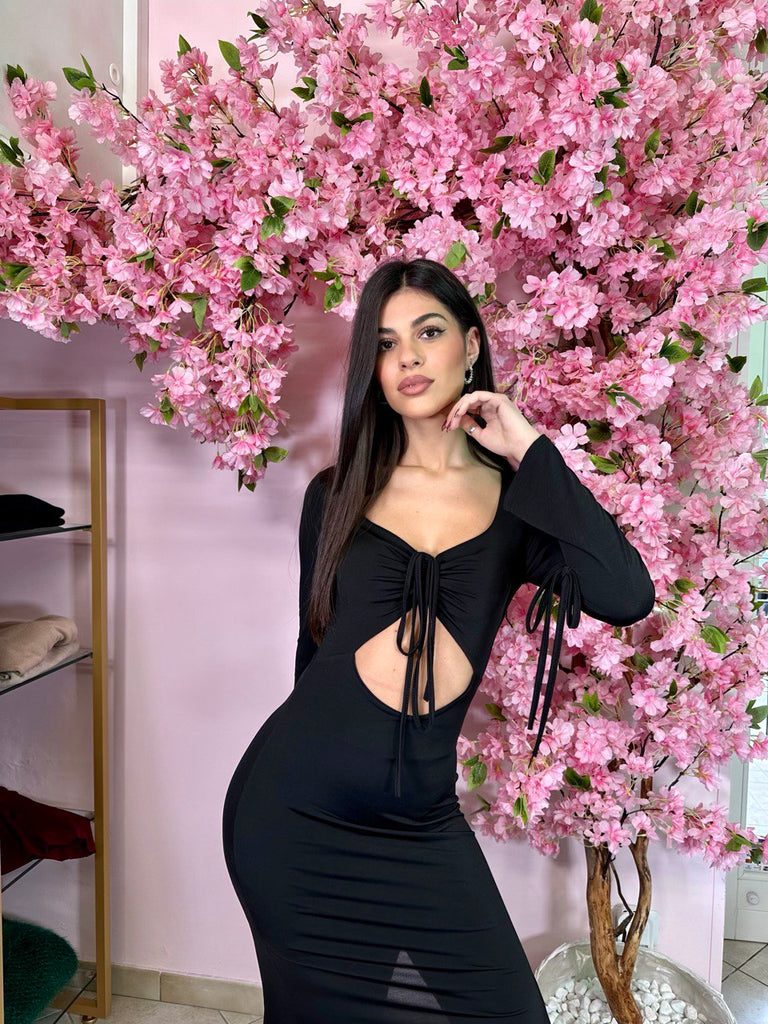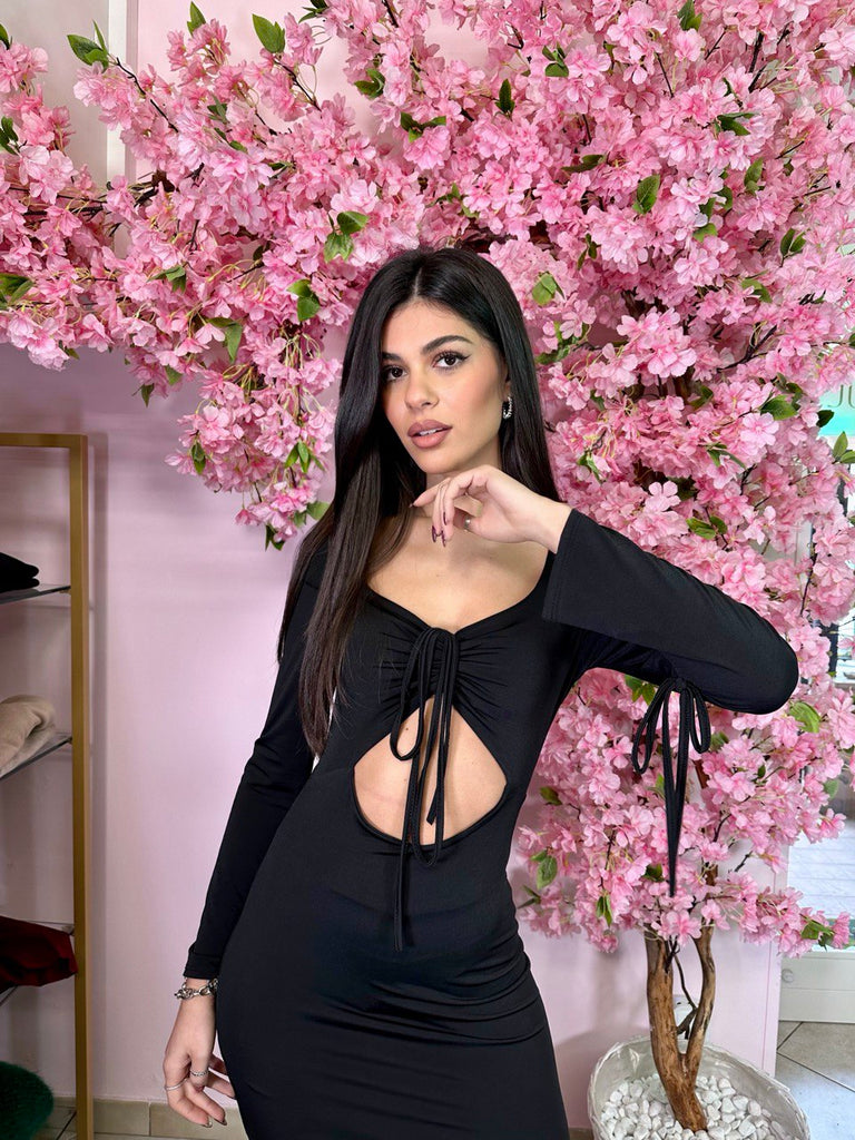 Abito longuette in lycra con cut out sul davanti, maniche a lanterna con laccetto e spacco laterale
