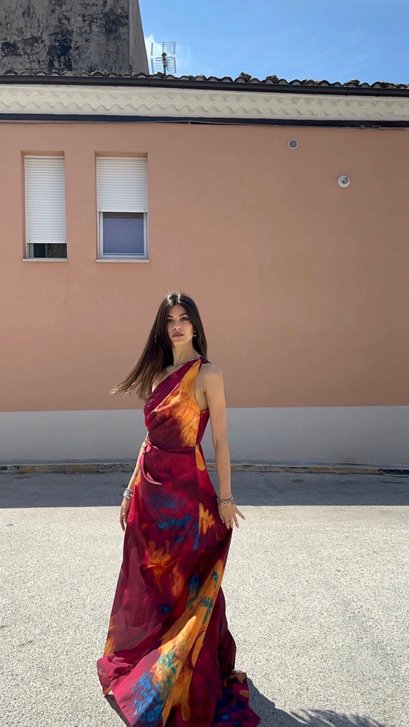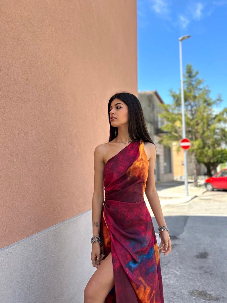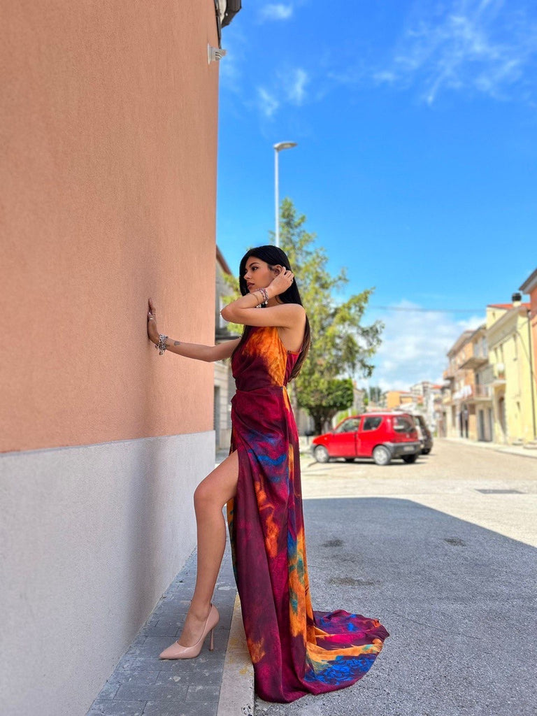Abito monospalla con strascico e spacco