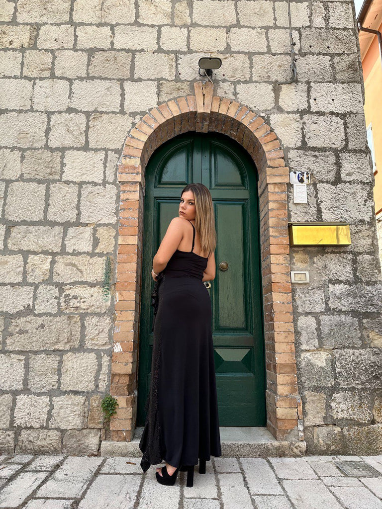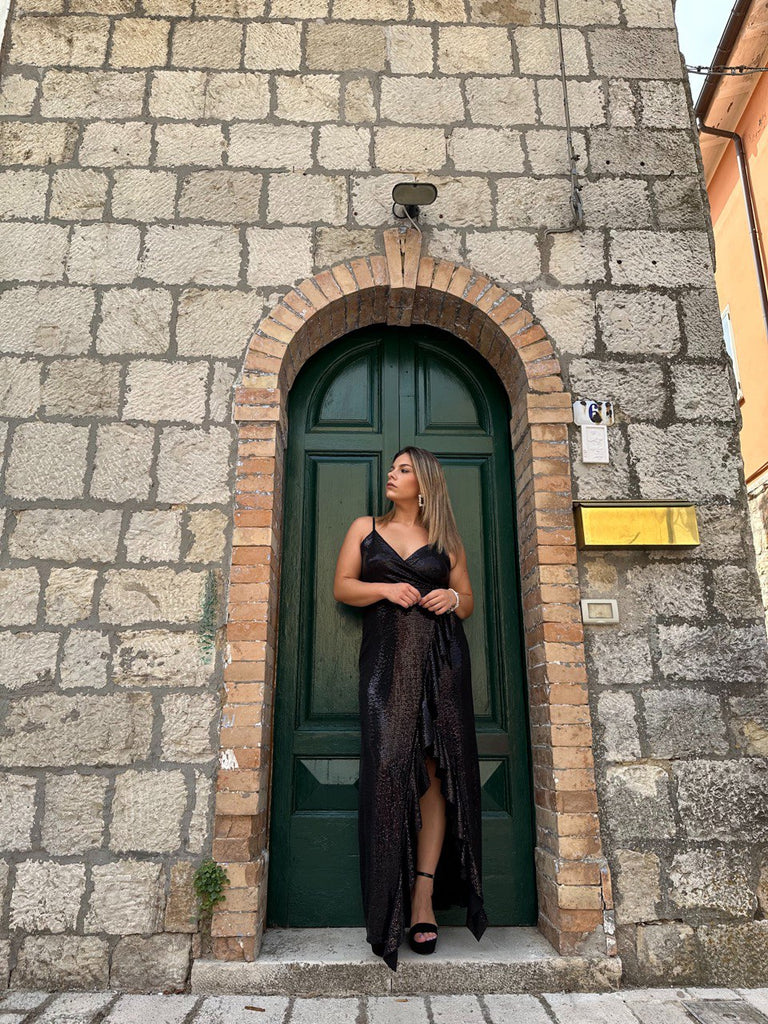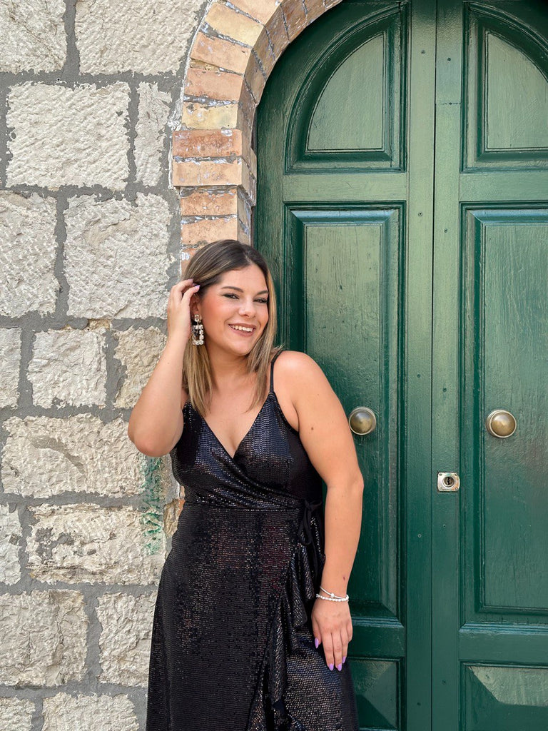 Abito a portafoglio con orlo asimmetrico, ricoperto di paillettes nella parte anteriore e sul retro in tessuto elasticizzato. Spalline regolabili