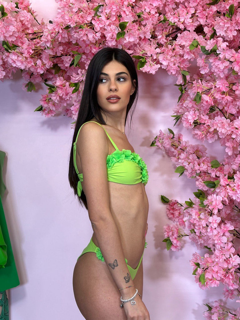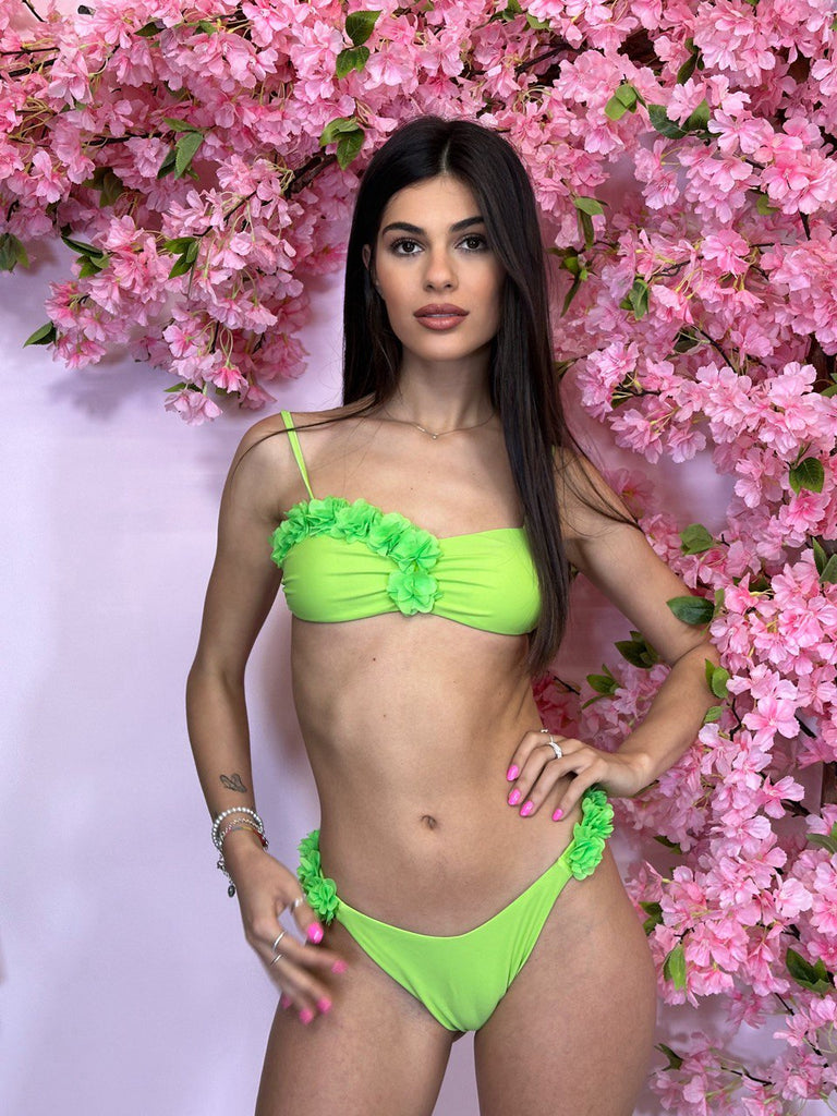 Costume due pezzi con applicazioni floreali. Il reggiseno ha coppe preinserite e spalline regolabili.