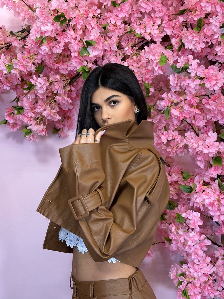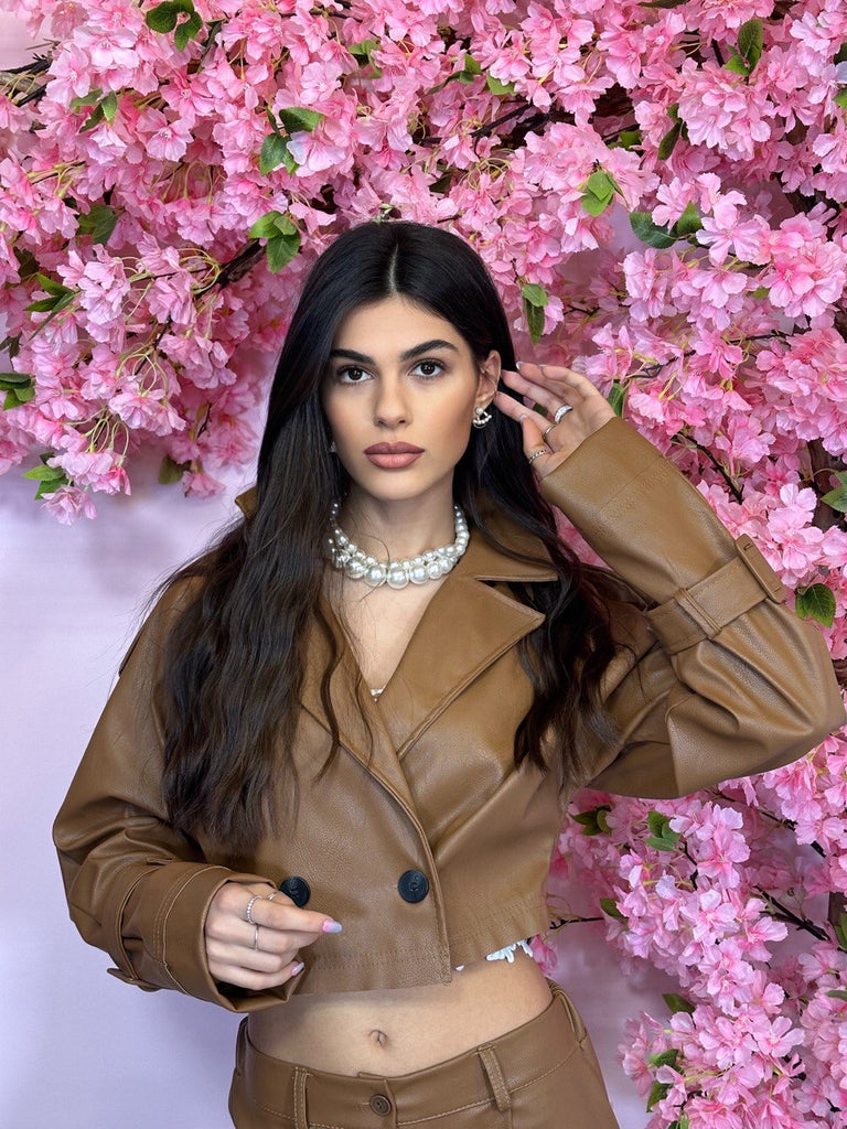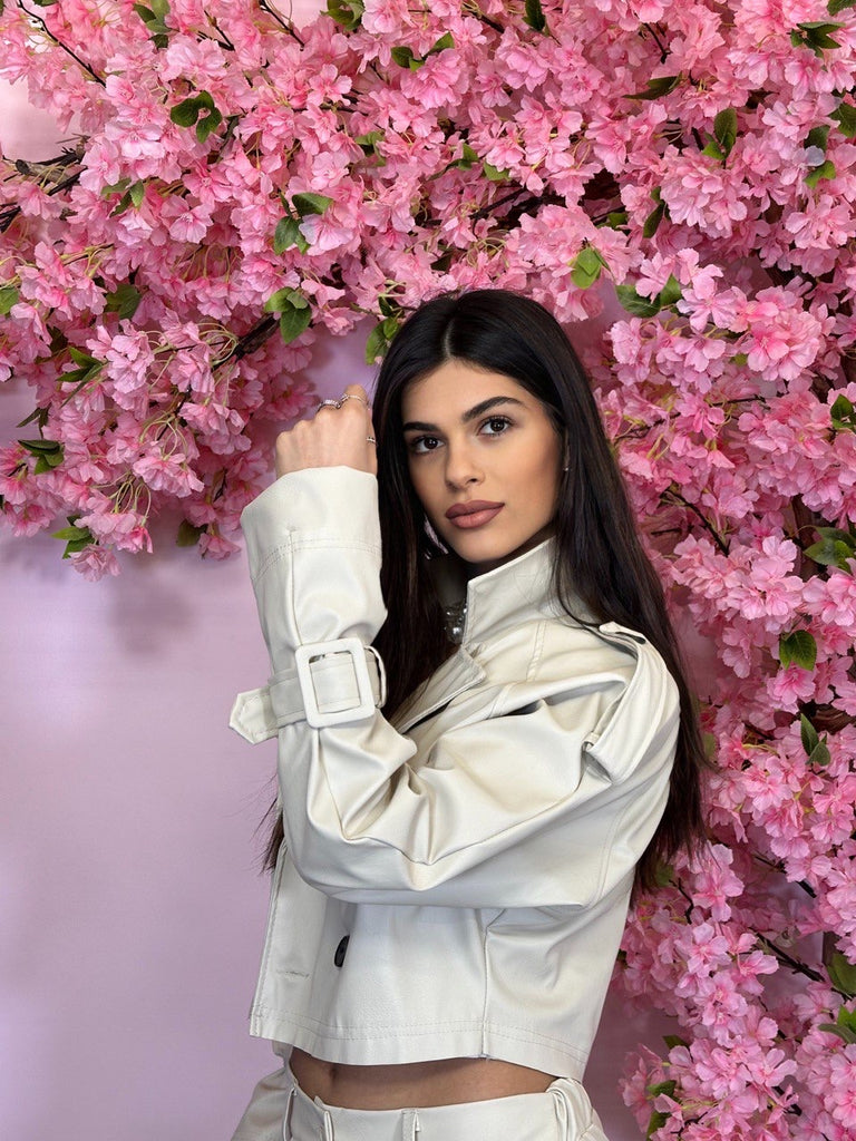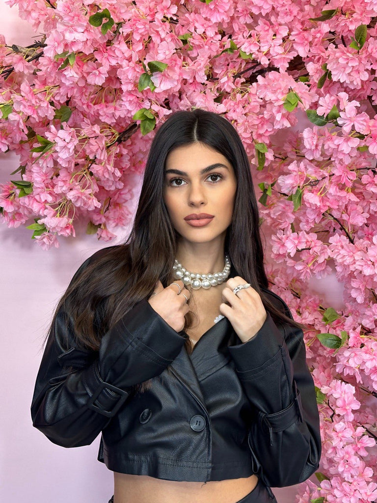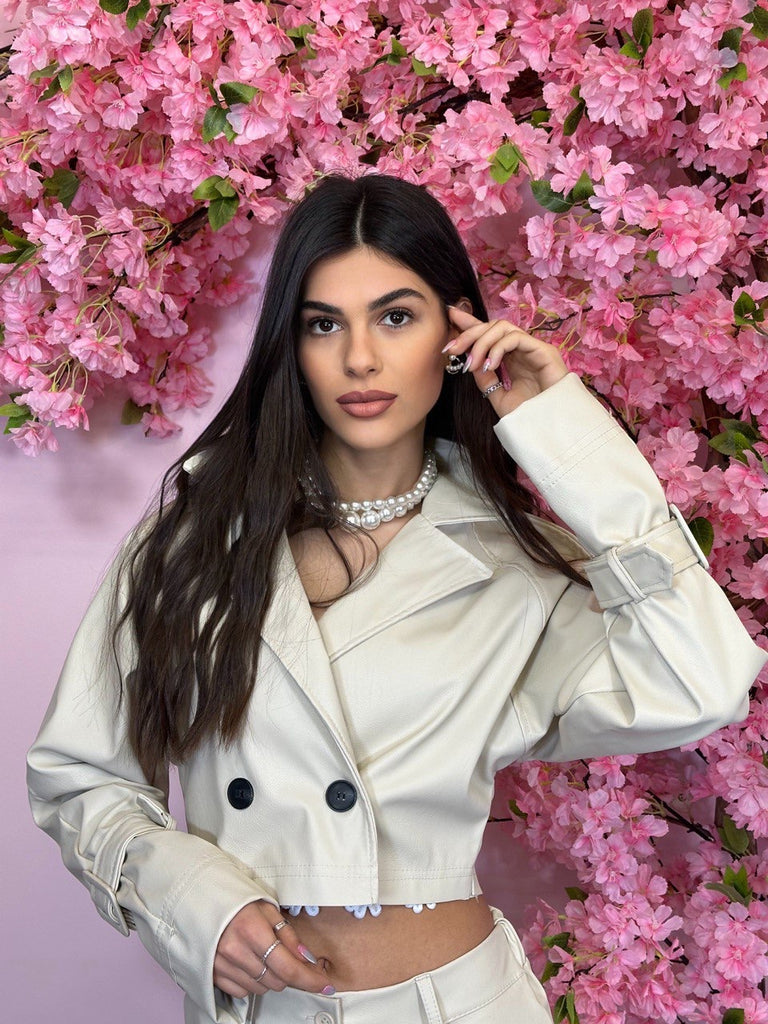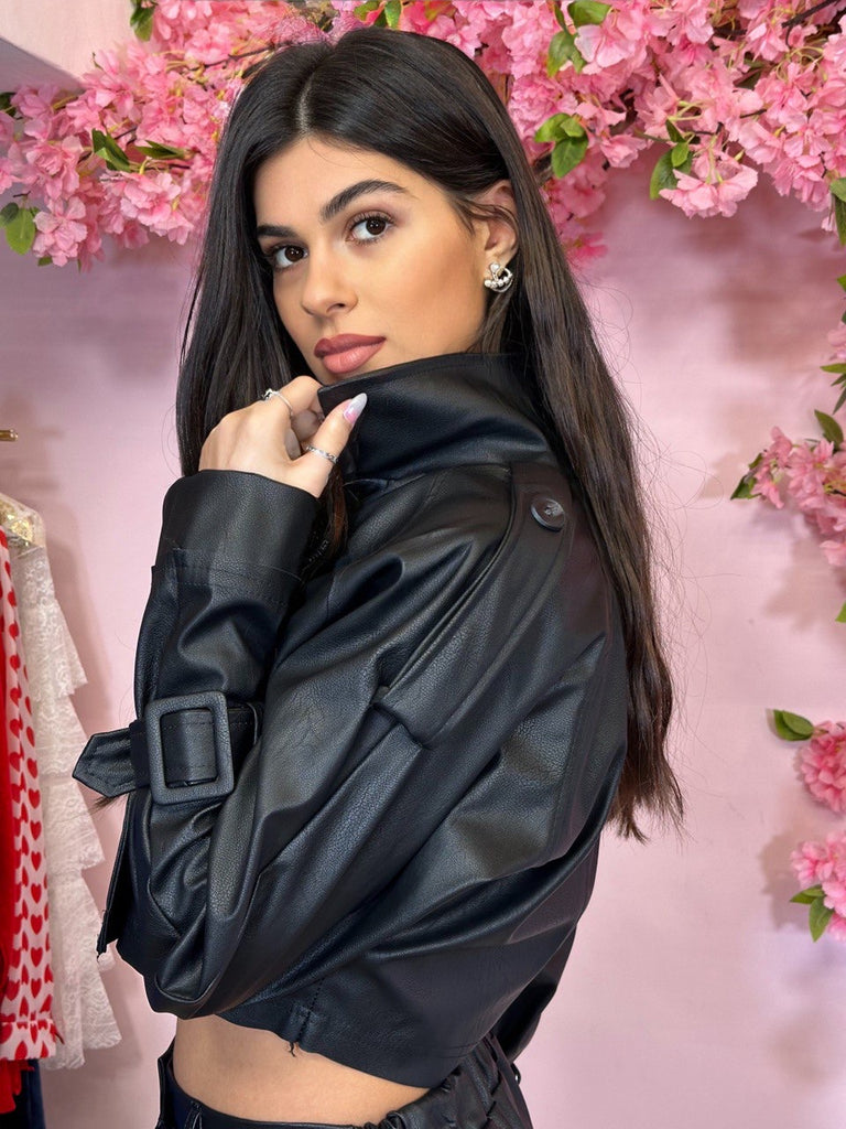 Giacca crop in ecopelle, doppio petto, modello a scatoletta con cintura sui polsi