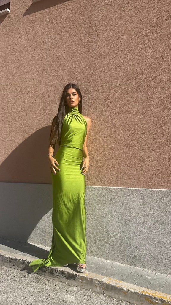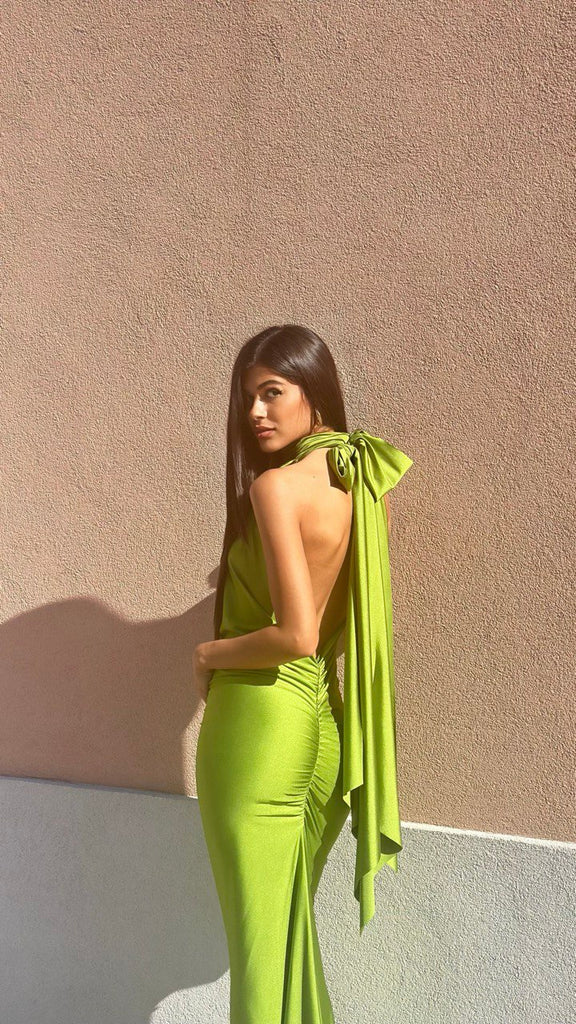 Abito in lycra con scollatura all’americana chiusa da una lunga fusciacca. Schiena completamente scoperta con arricciatura nella parte finale