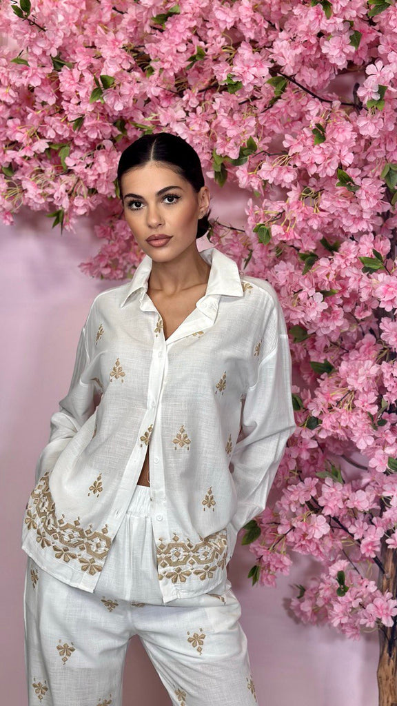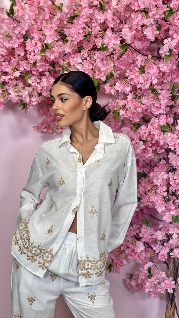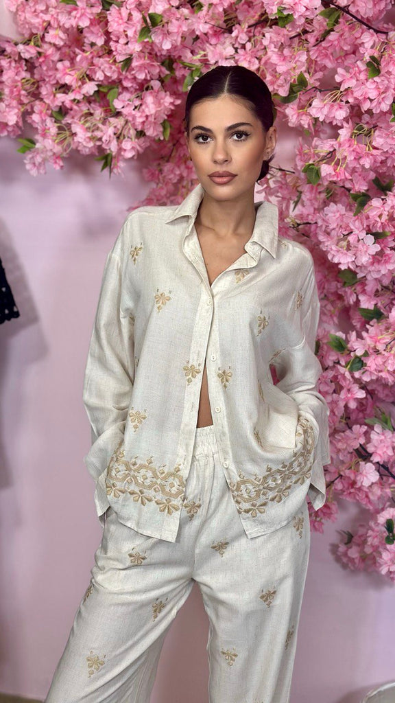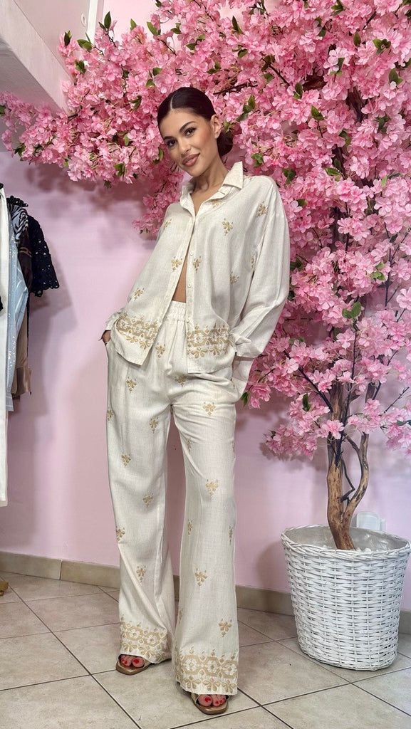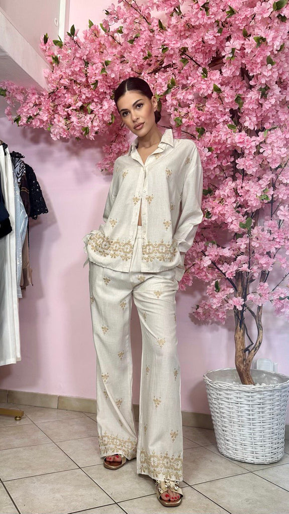 Coordinato con pantalone palazzo con elastico in vita e camicia con decori sabbia