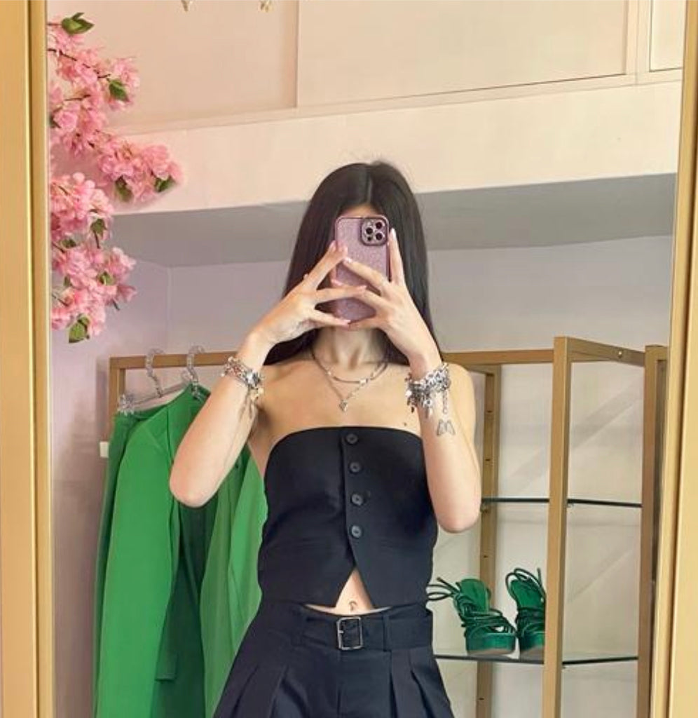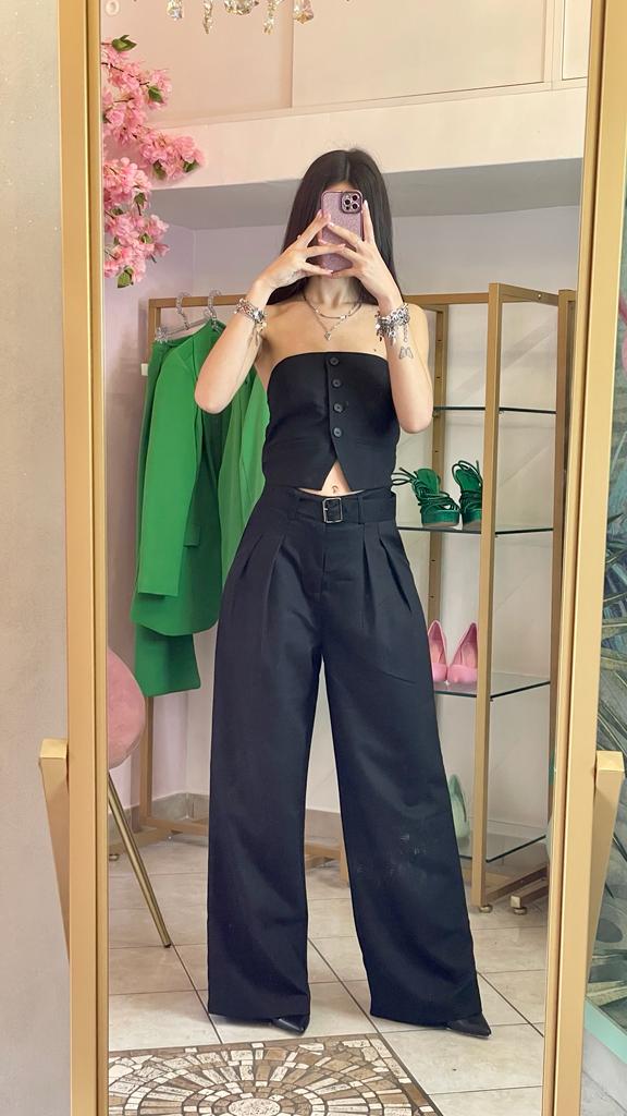 Coordinato con pantalone palazzo con cintura e crop top con bottoni