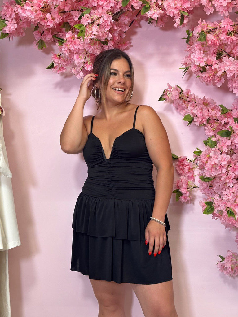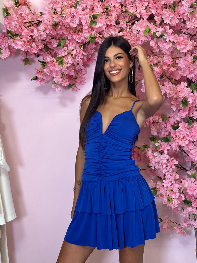 Abito in lycra con bustino arricciato, scollatura strutturata, coppe preinserite, balze e spalline regolabili