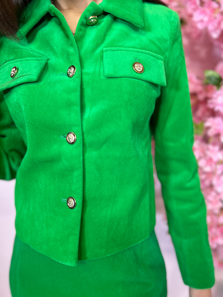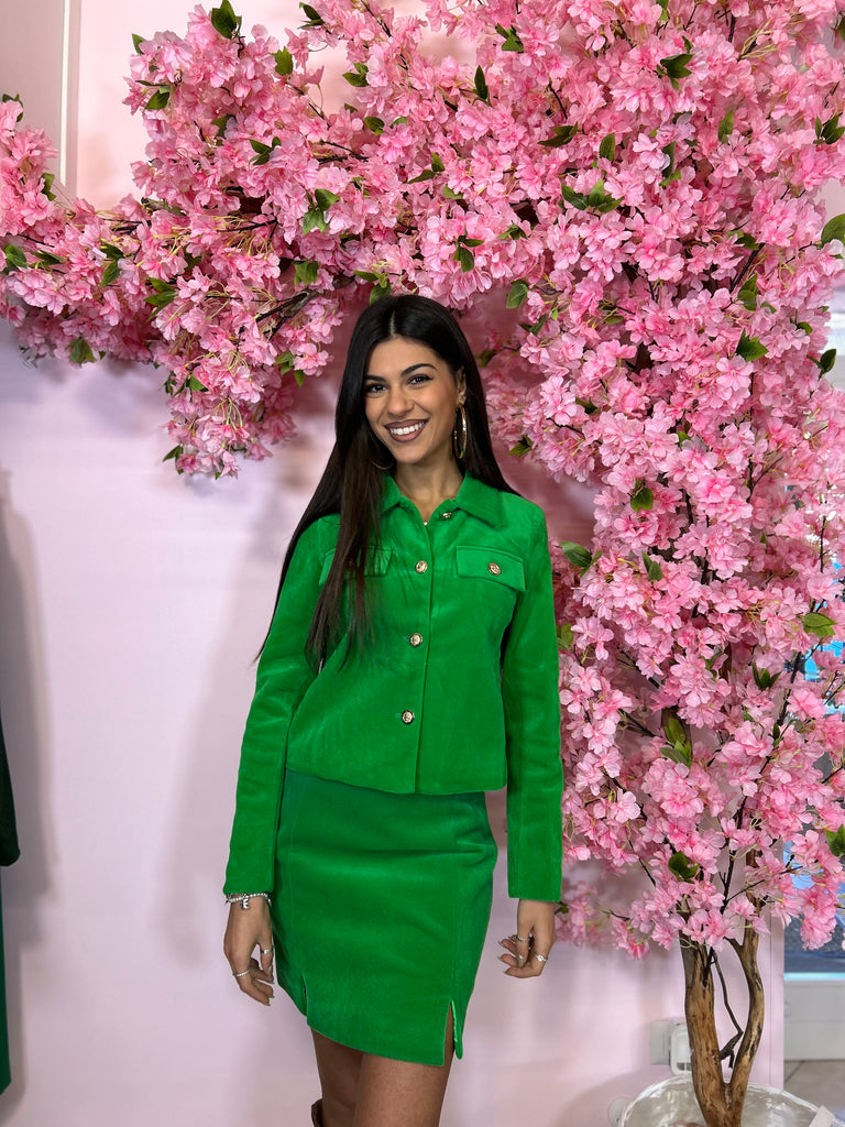 Coordinato bon ton in velluto con minigonna con spacchetto e giacca modello Chanel