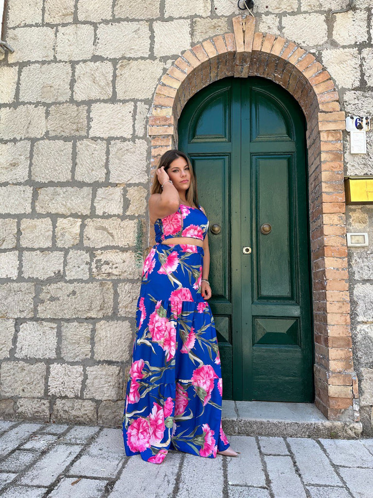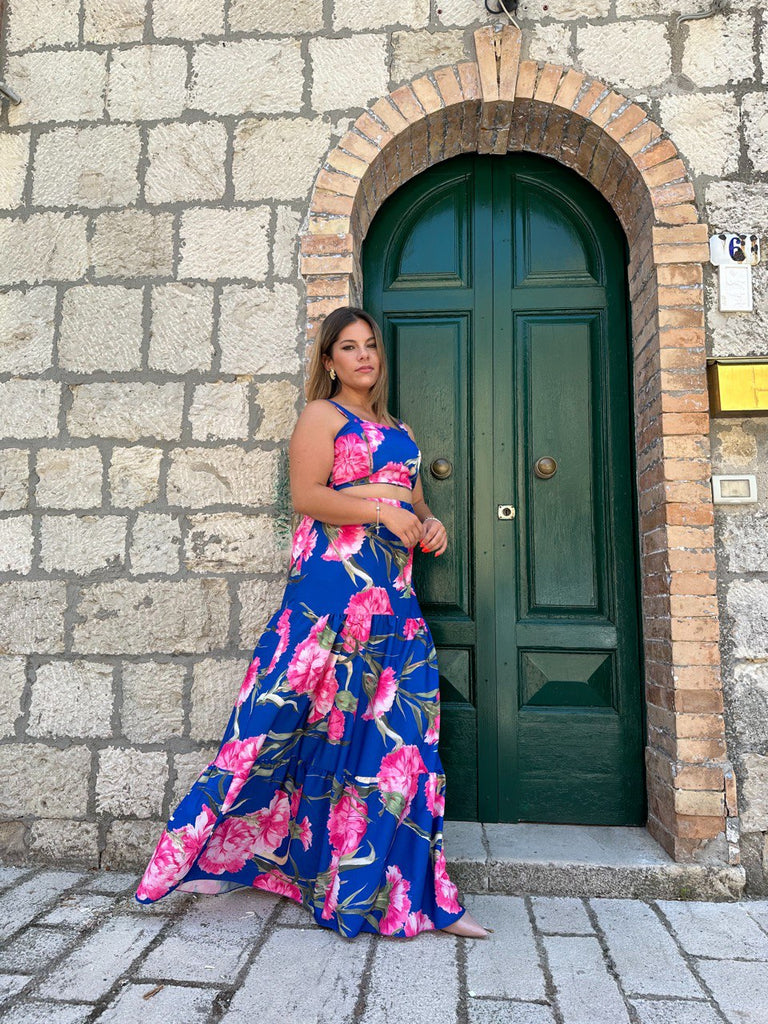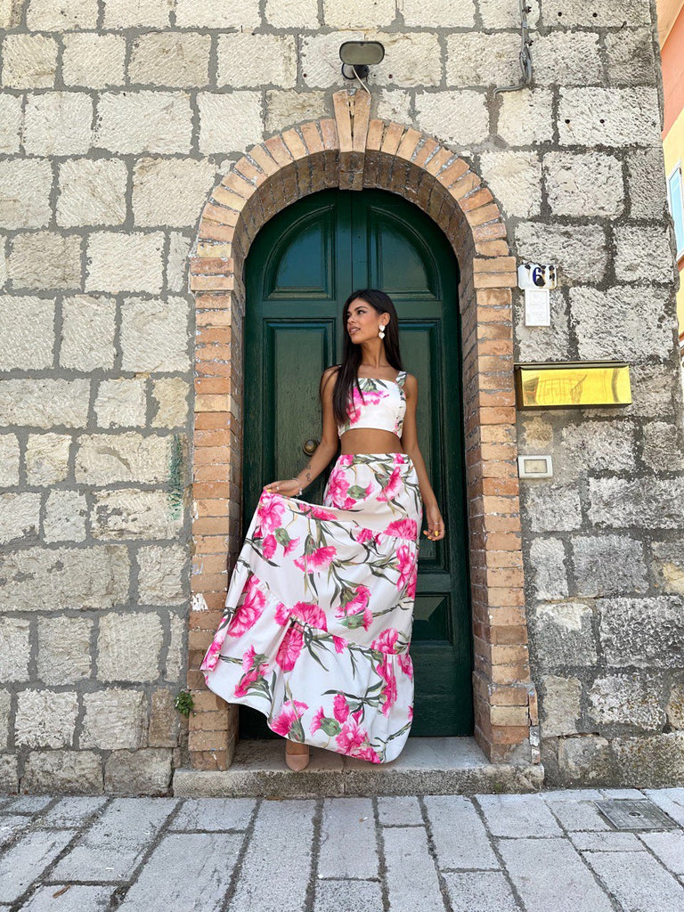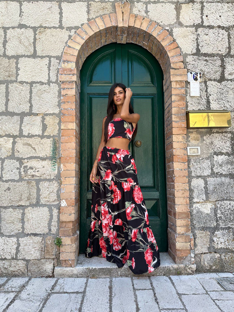 Coordinato composto da gonna con balza in fondo ed elastico in vita e top crop con elastico sul retro e coppe preinserite