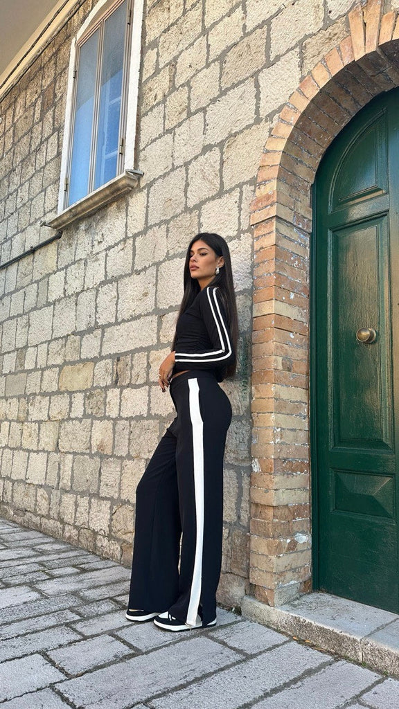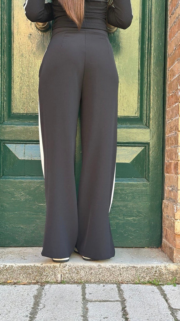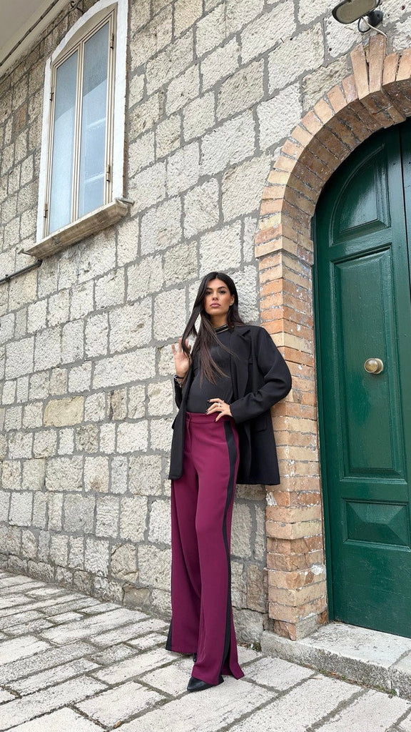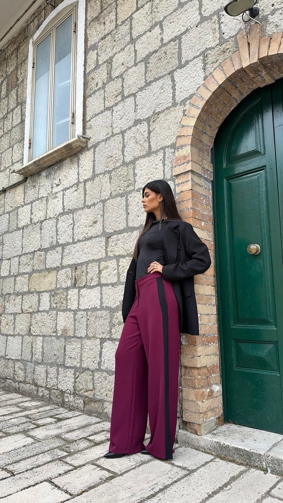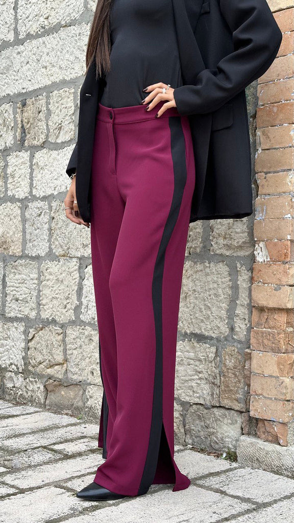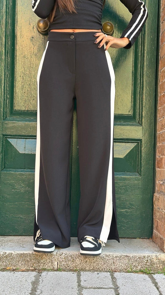 Pantaloni in tessuto fluido, gamba larga, banda laterale e spacchetto all’altezza della caviglia