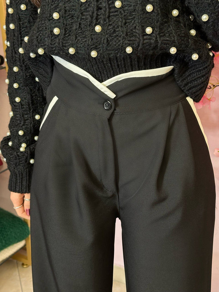 Pantalone palazzo a vita alta con profili chiari in vita e sulle tasche a filetto