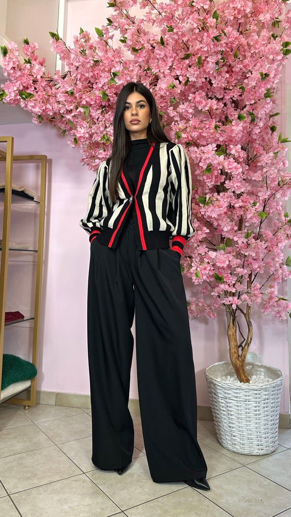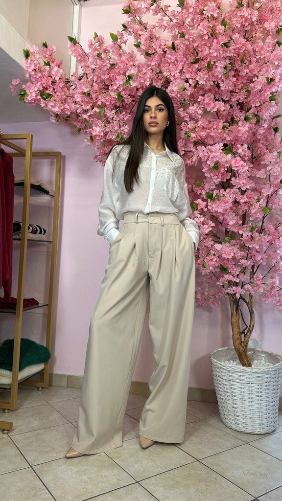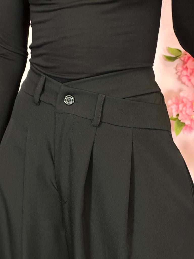 Pantaloni palazzo con allacciatura asimmetrica. Ottima vestibilitá, elastico sul retro