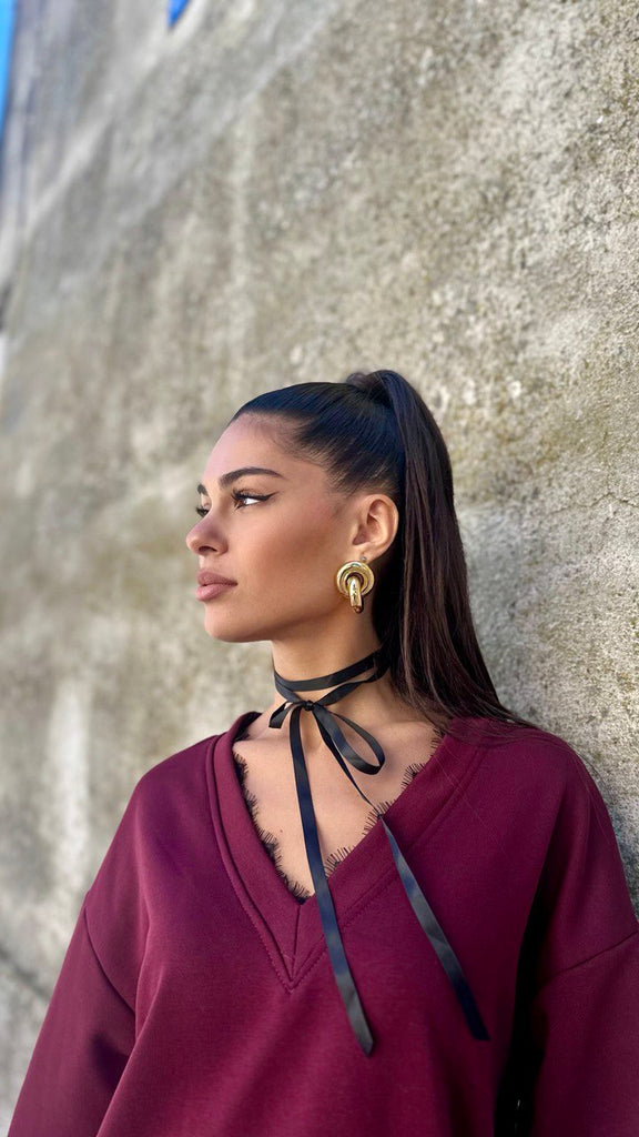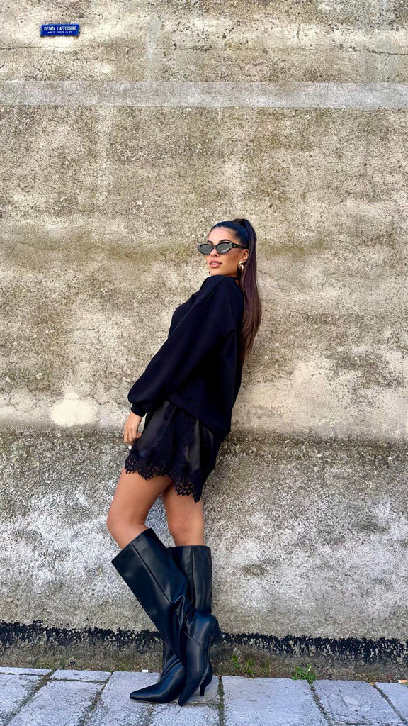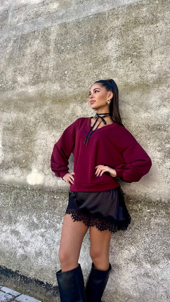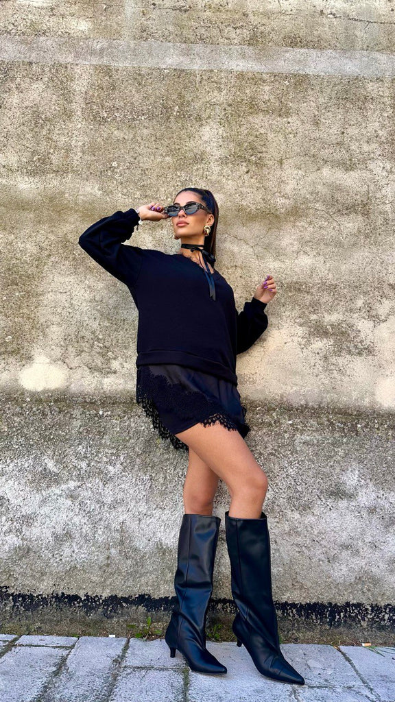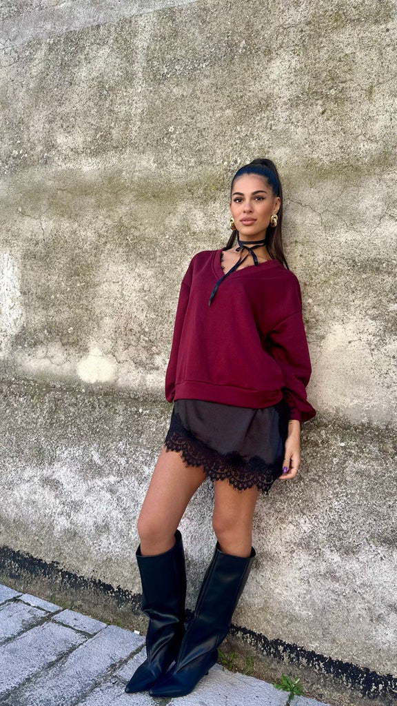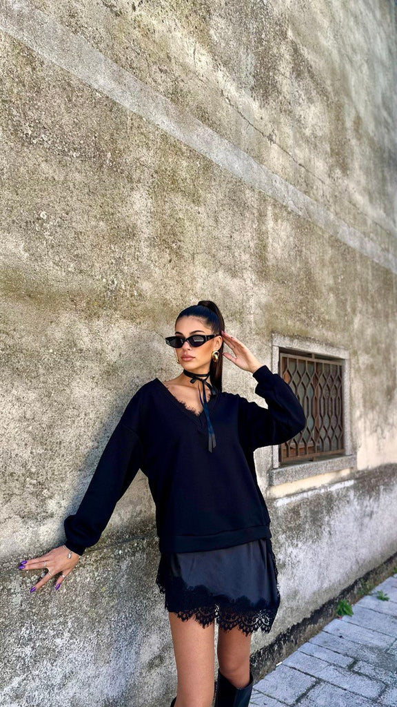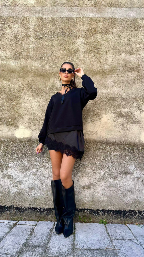 Felpa con scollatura a V e slip dress in satin con orlo asimmetrico e profili in pizzo incluso