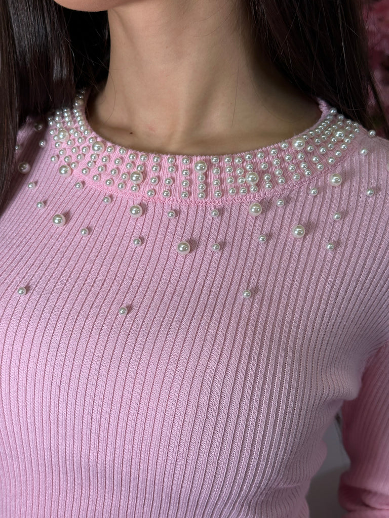 Maglioncino in cotone elasticizzato a costine con applicazioni di perle sulla scollatura e manica a lanterna