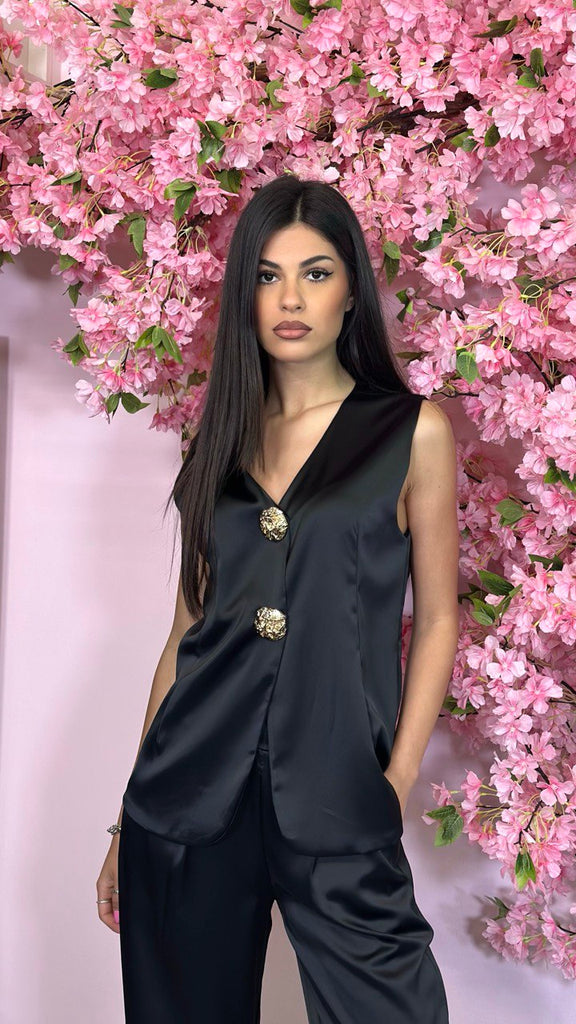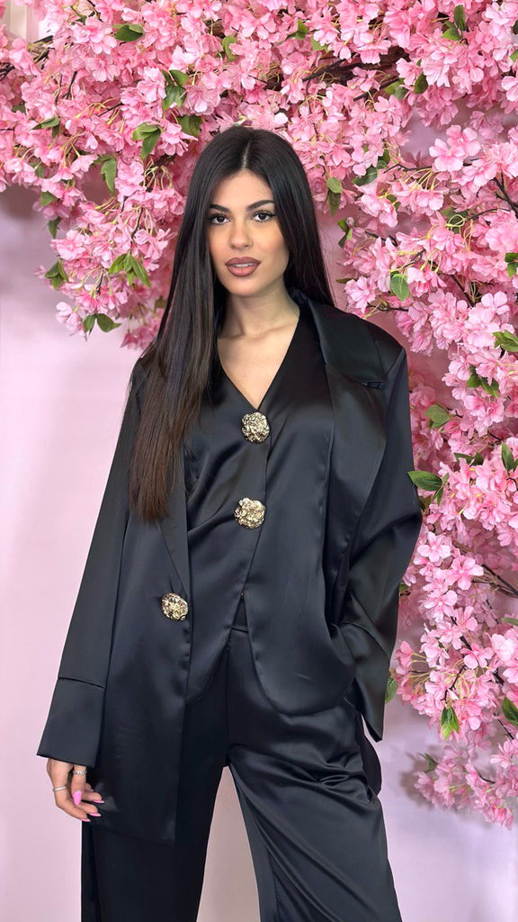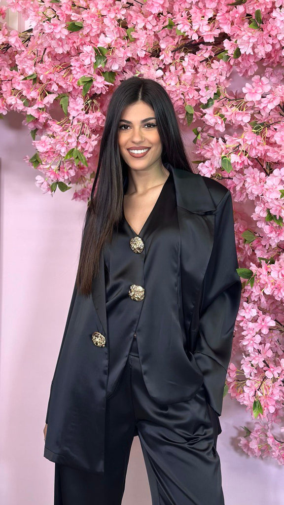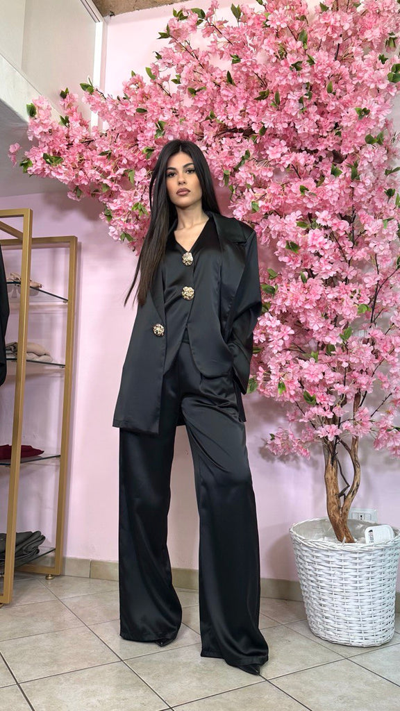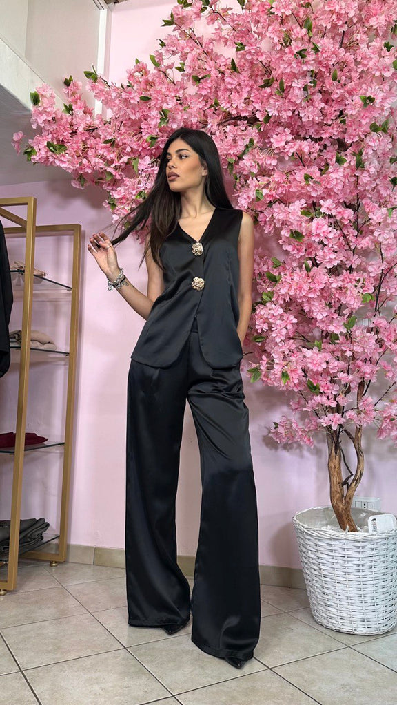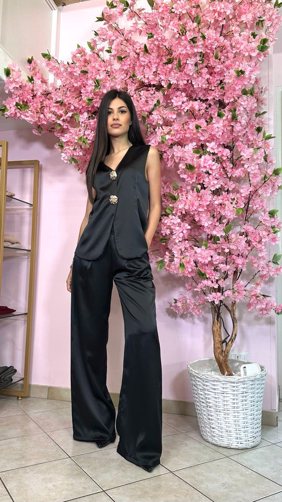 Tailleur 3 pezzi in simil raso con bottoni gioiello, composto da pantalone palazzo con elastico sul retro, gilet e giacca monopetto.