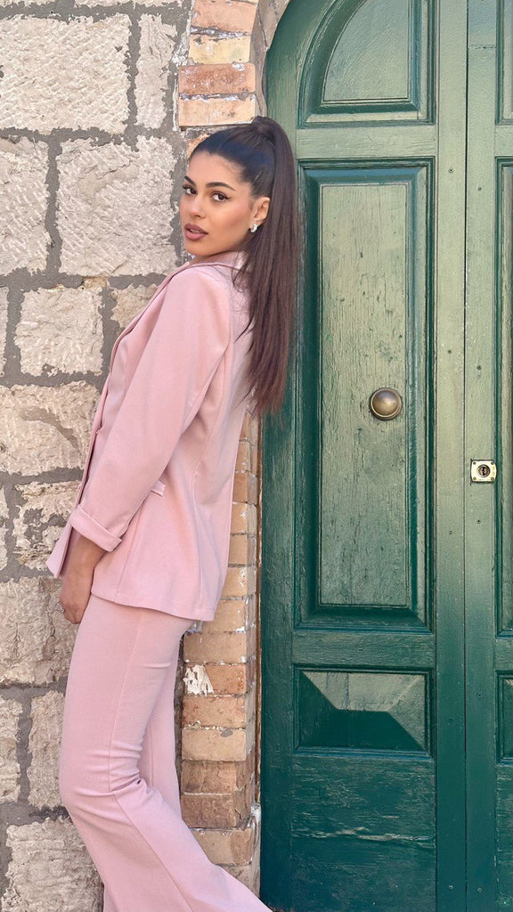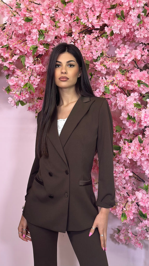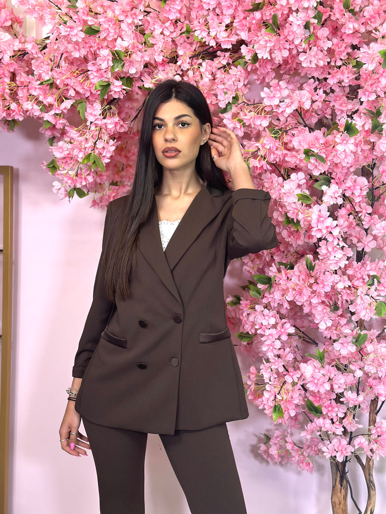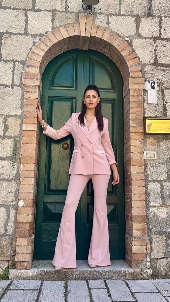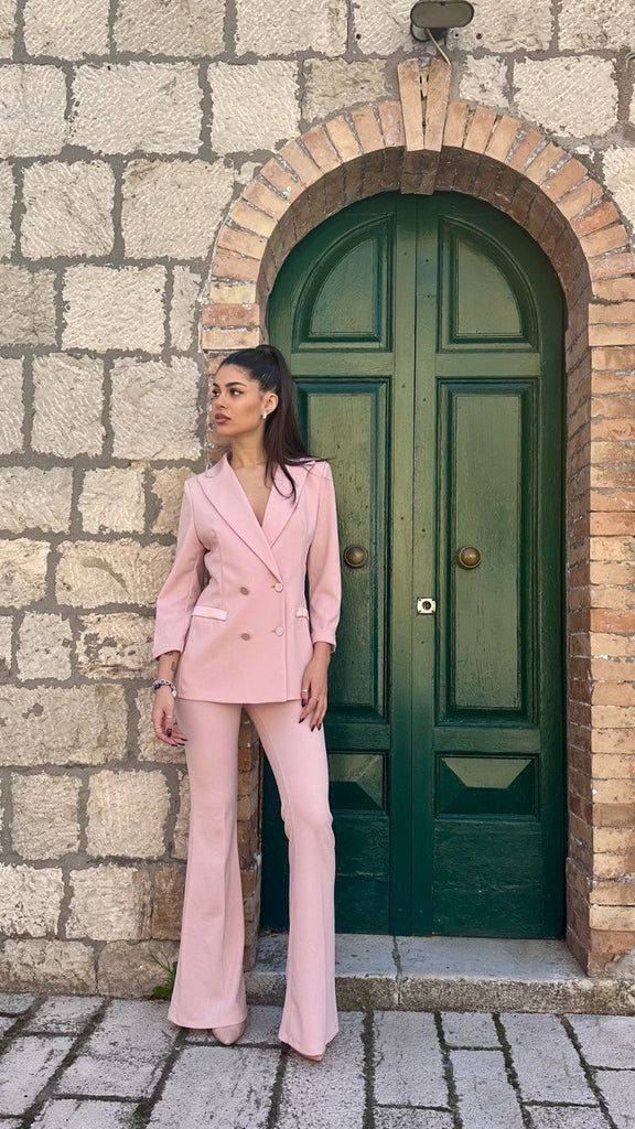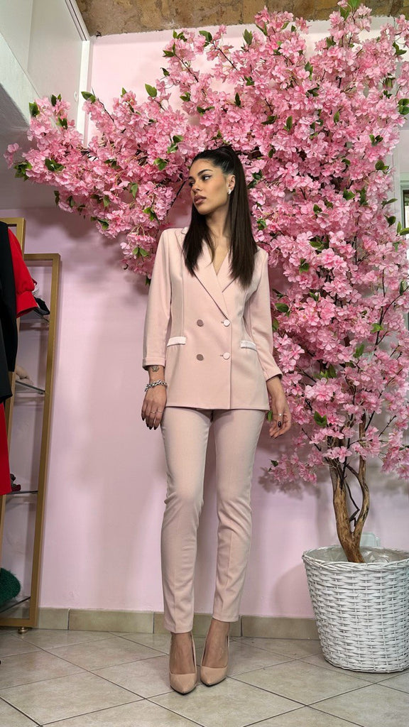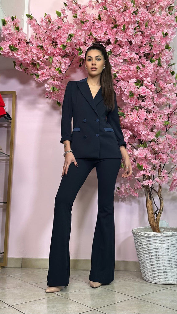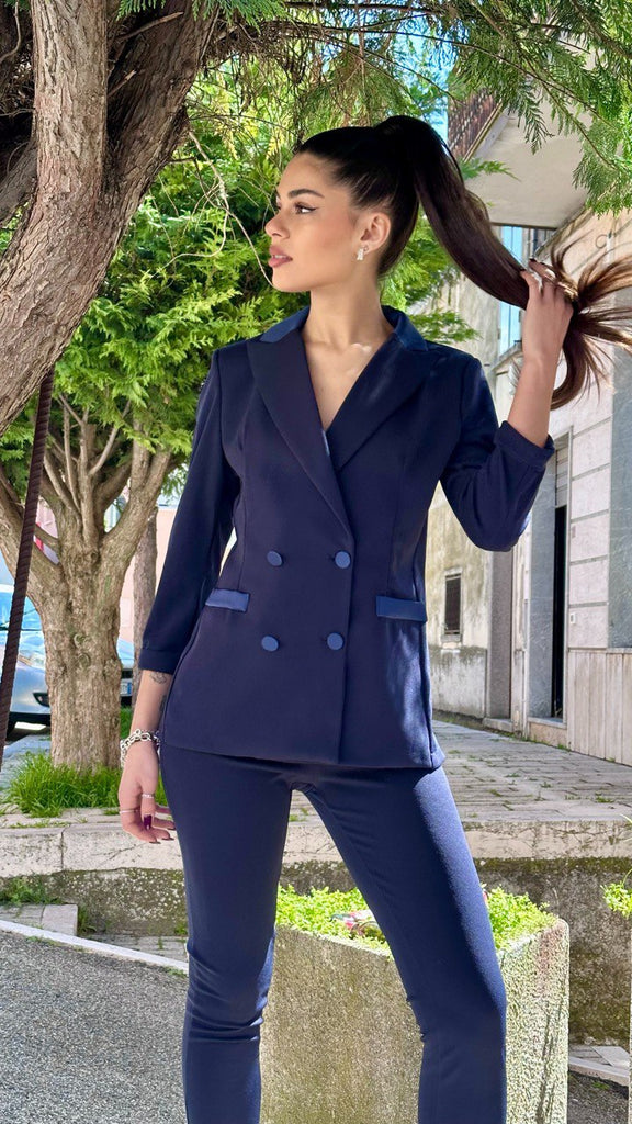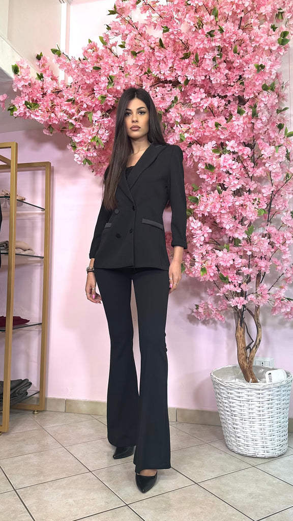 Tailleur modello smoking composto da blazer doppio petto, con colletto, tasche e bottoni in raso. Ha l’opzione del pantalone a zampa o modello Capri, entrambi con fascia in vita in raso.