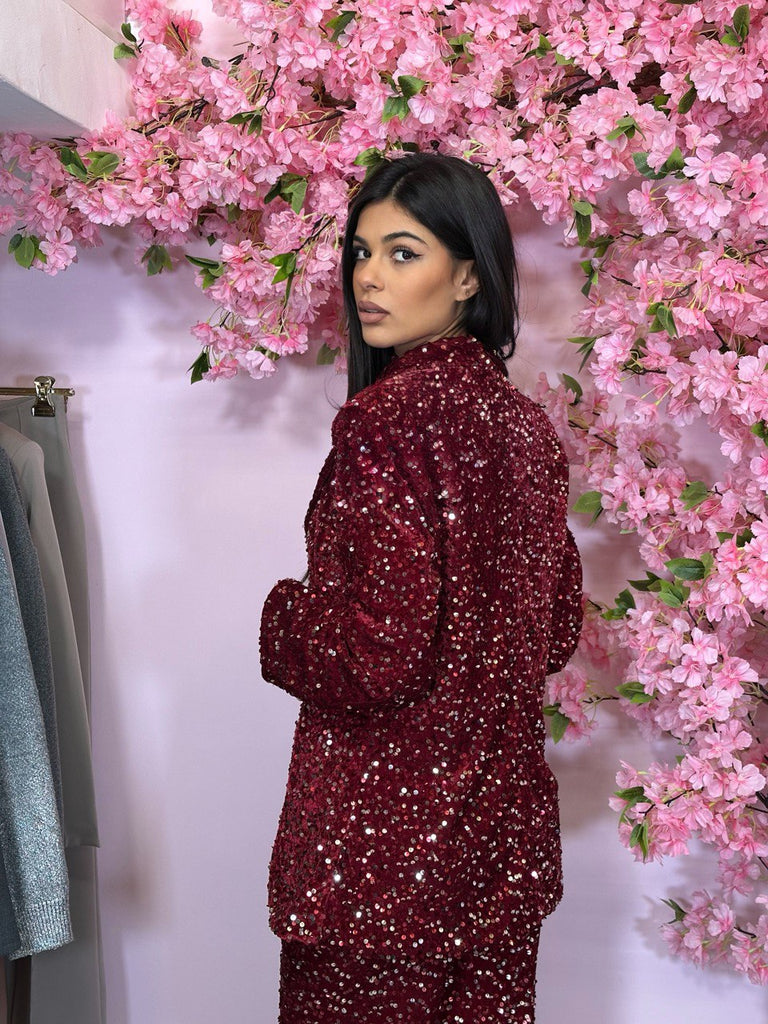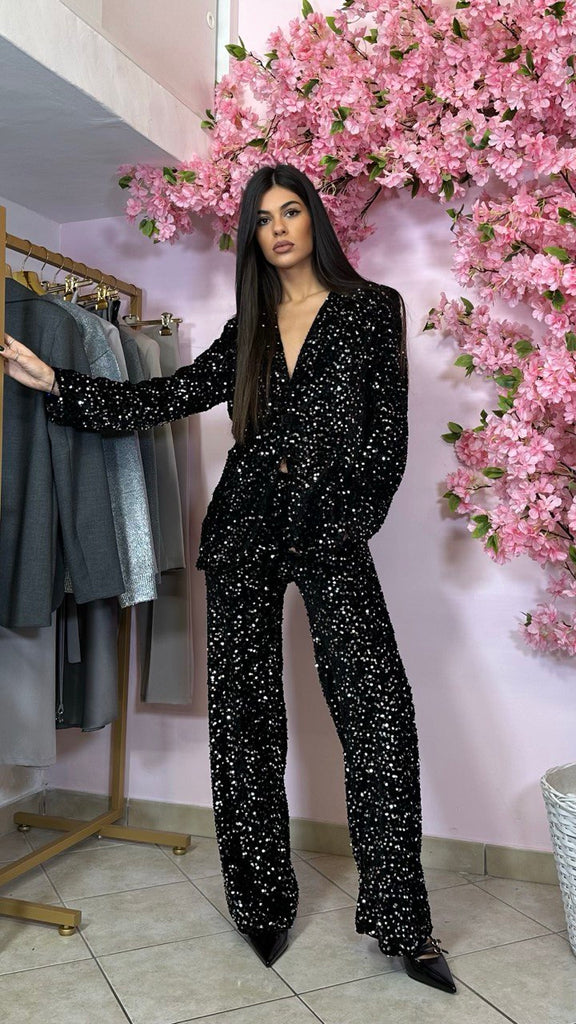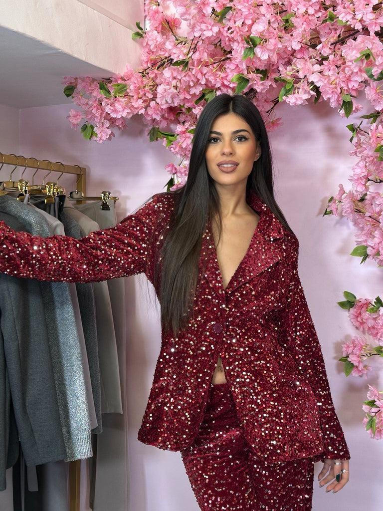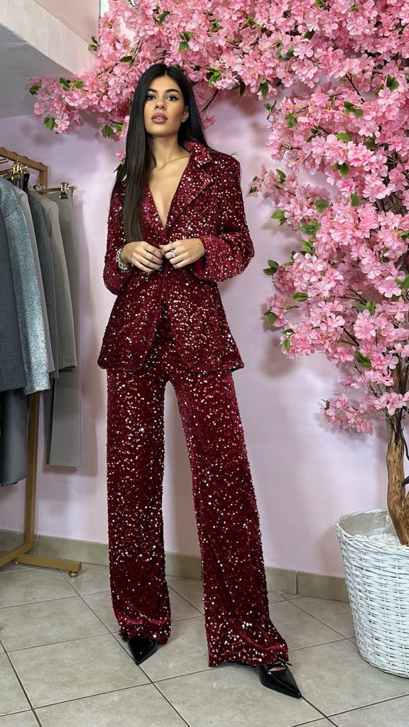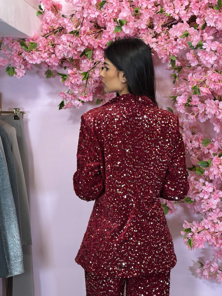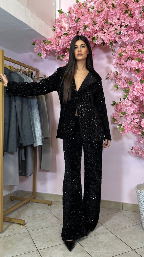 Tailleur in paillettes, composto da pantaloni palazzo con elastico in vita e giacca monopetto con reverse classico
