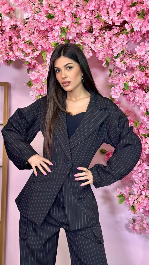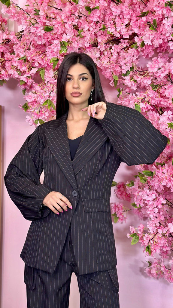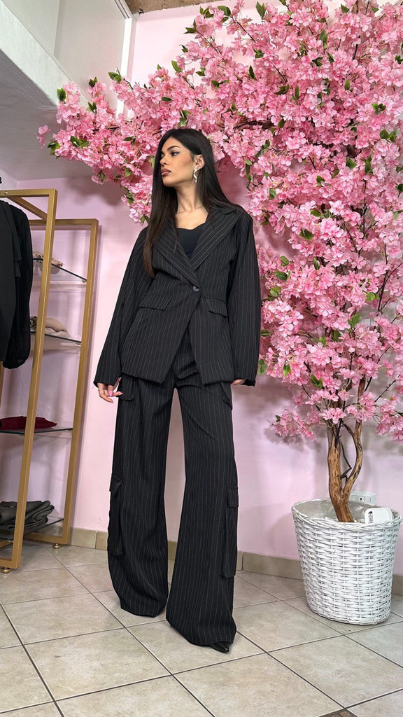 Tailleur gessato con pantalone cargo palazzo, con elastico in vita e blazer doppiopetto asimmetrico e maniche a palloncino