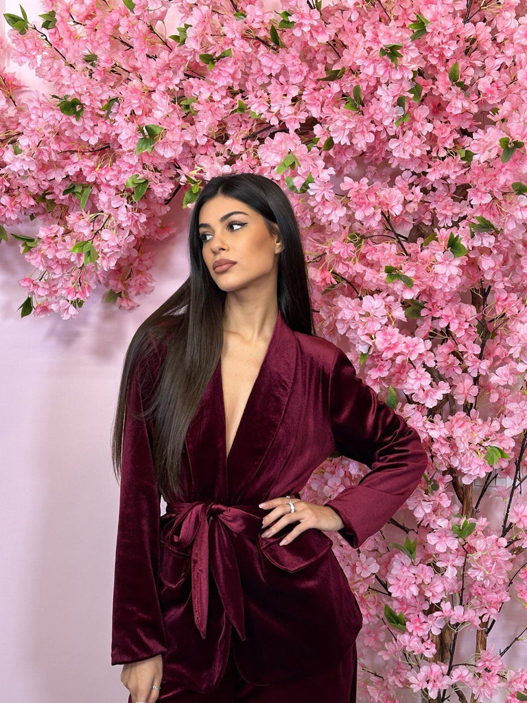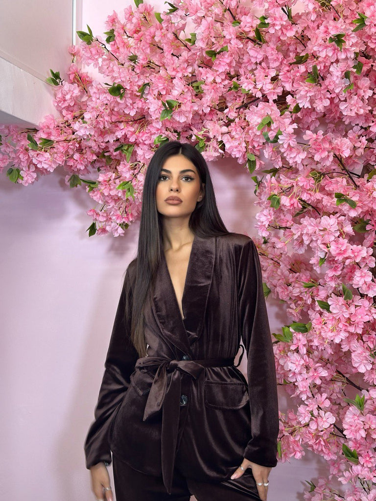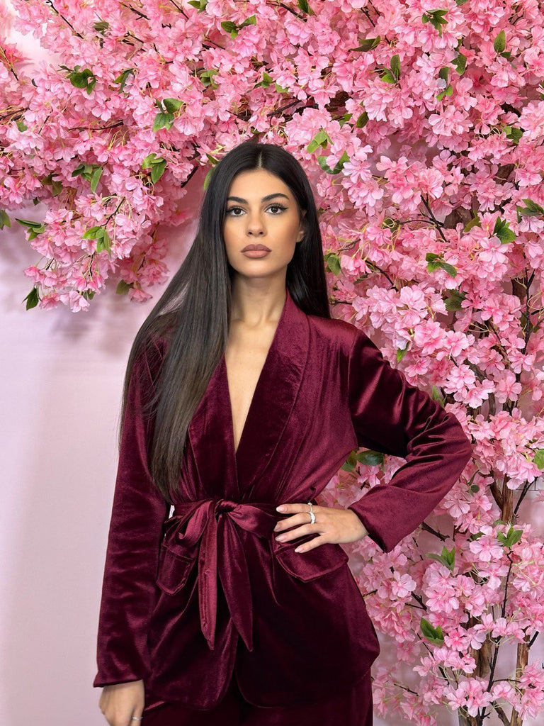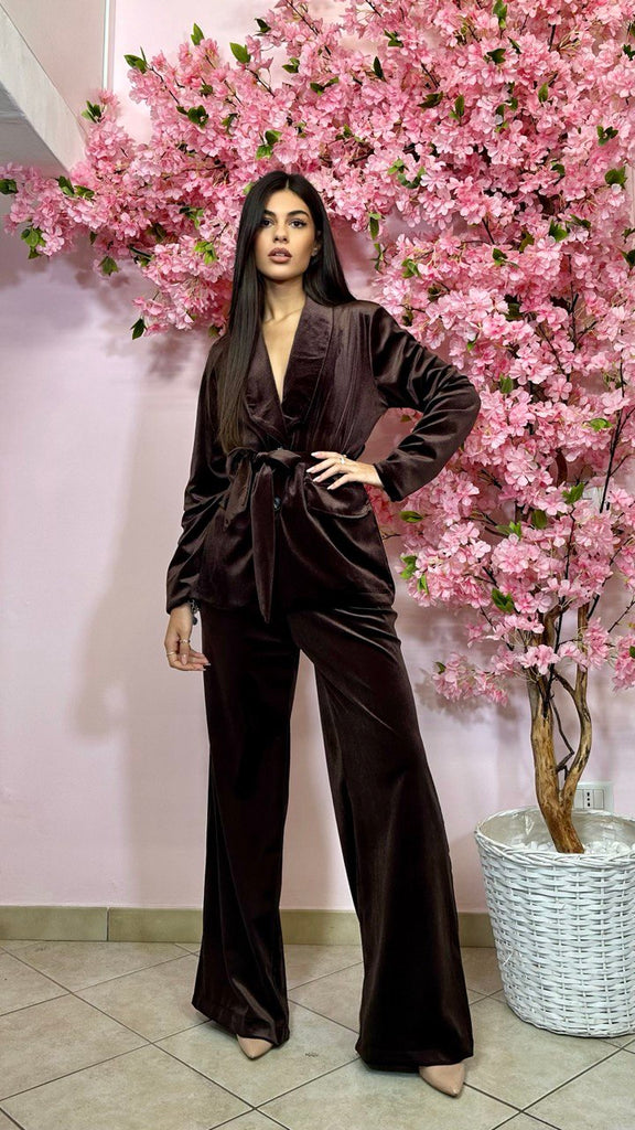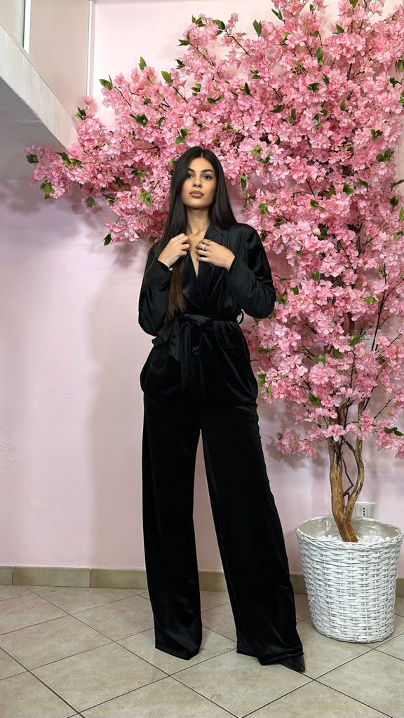 Tailleur in velluto liscio, con pantaloni palazzo con elastico sul retro e giacca con fusciacca in vita.
