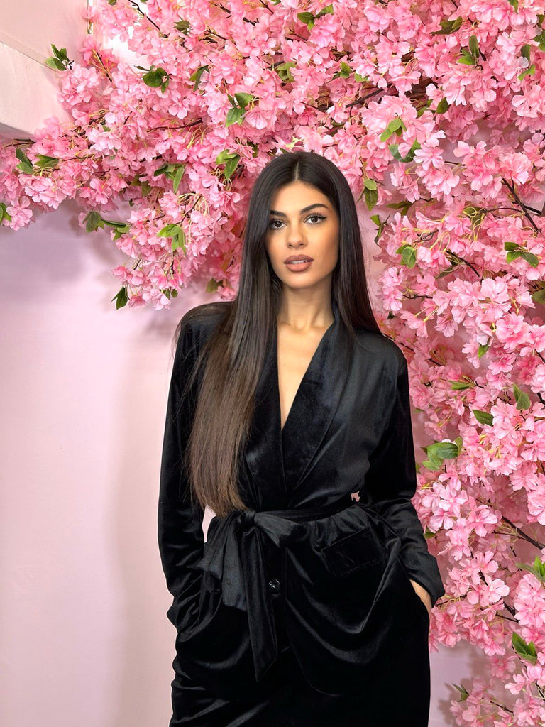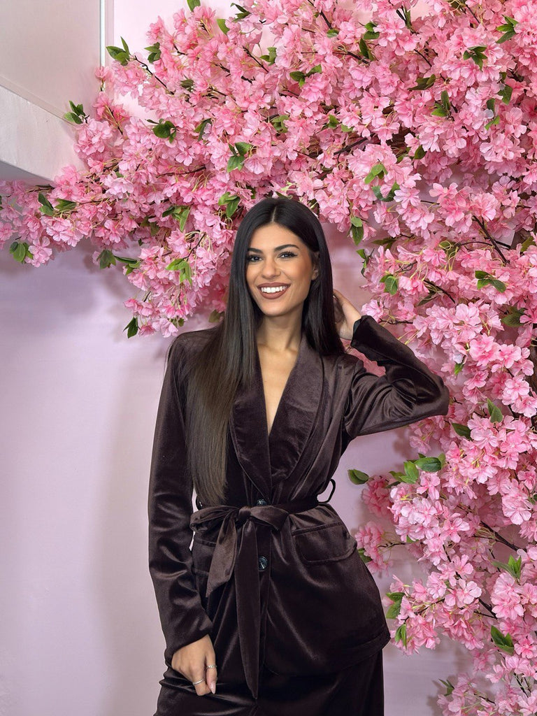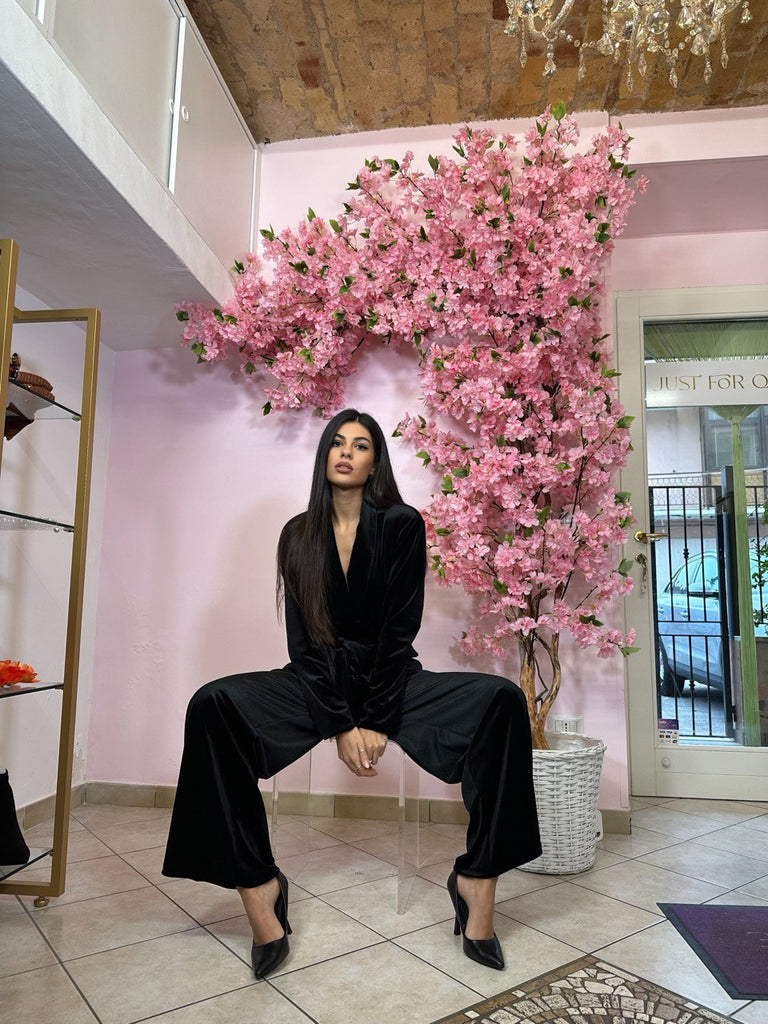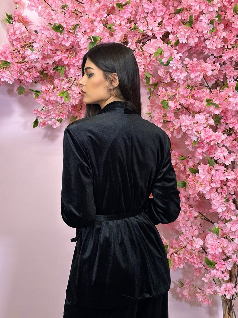 Tailleur in velluto liscio, con pantaloni palazzo con elastico sul retro e giacca con fusciacca in vita.