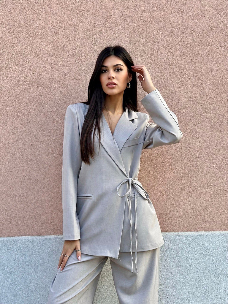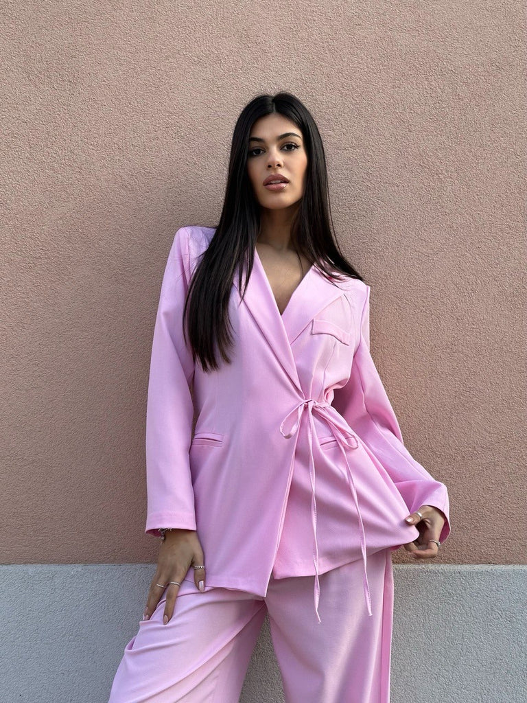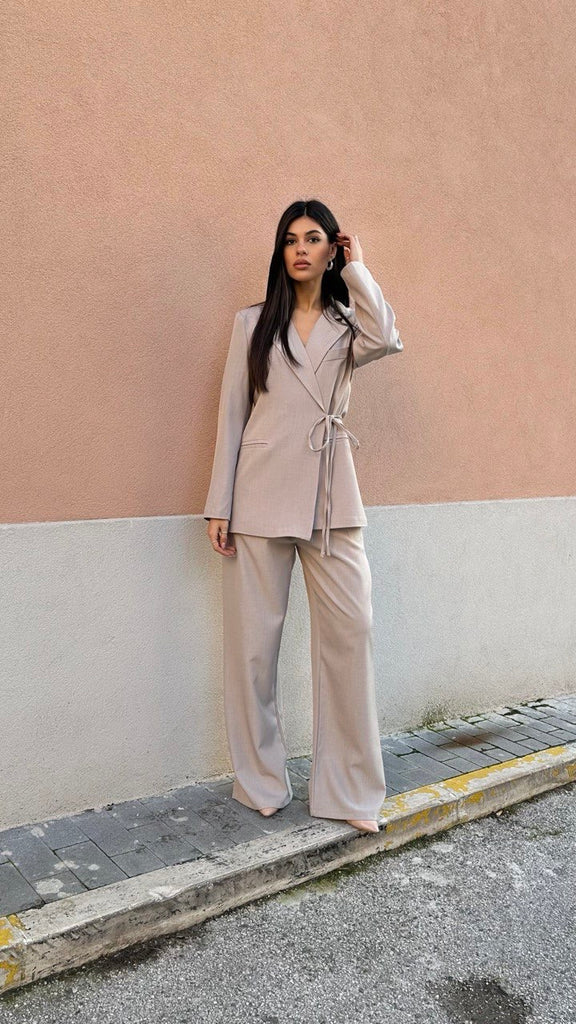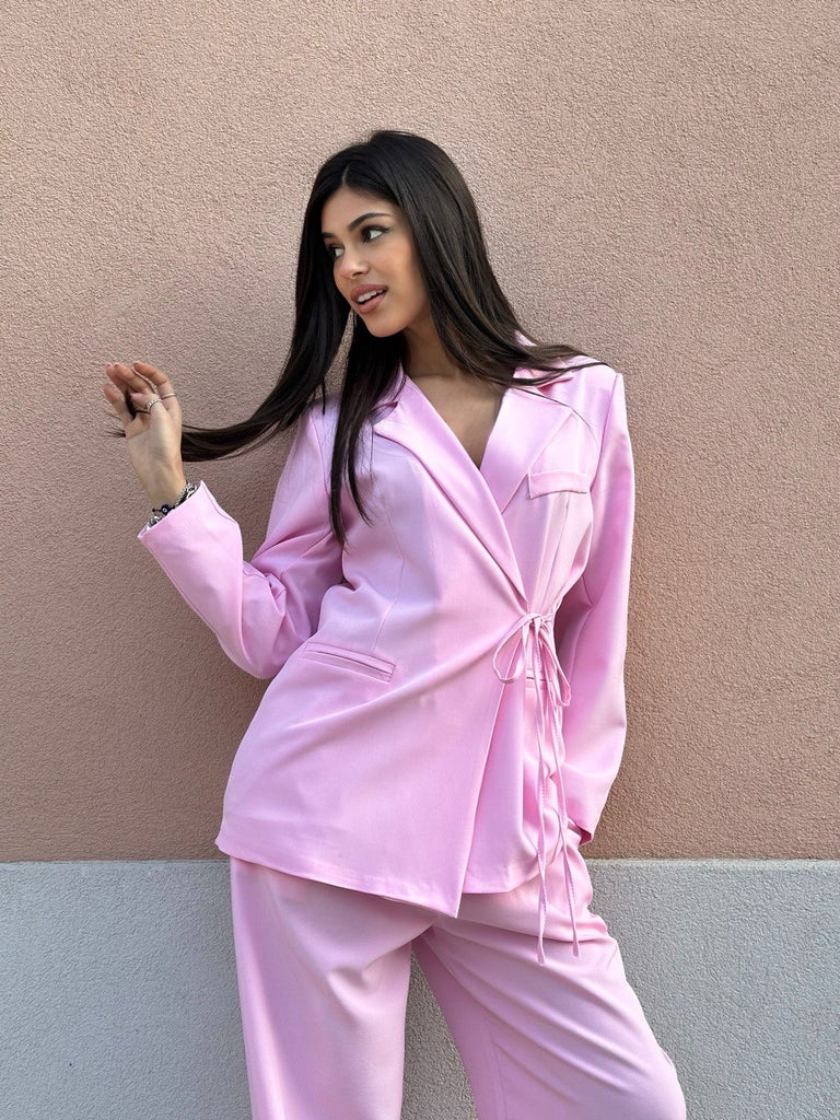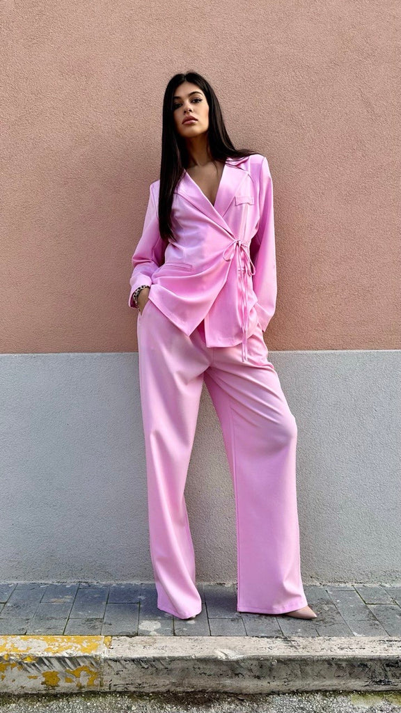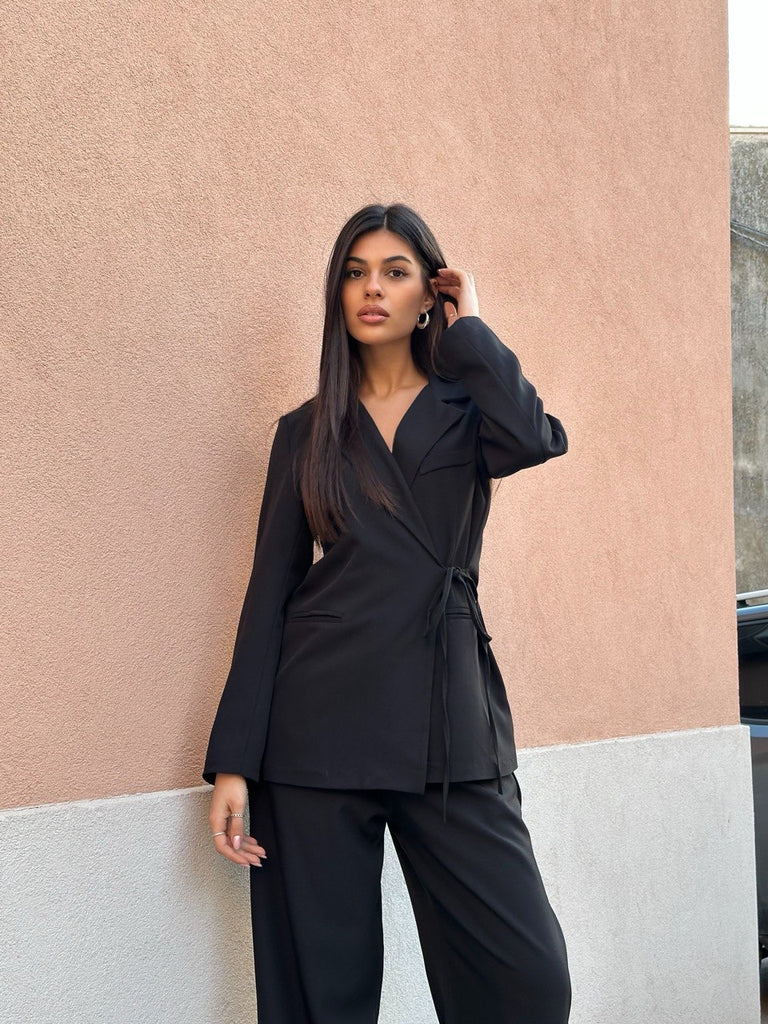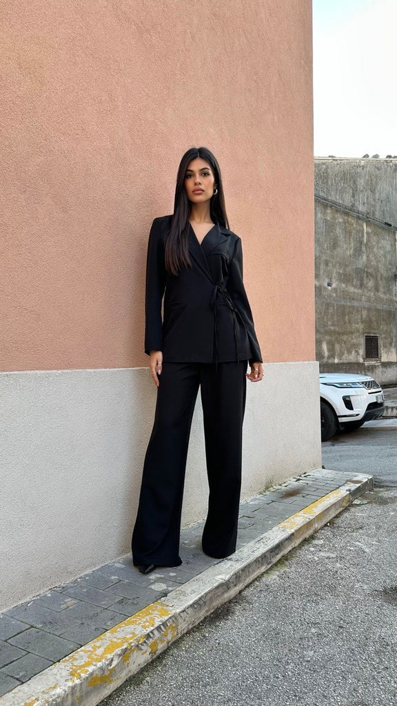 Tailleur composto da pantalone palazzo con elastico sul retro e giacca a portafoglio con laccetto