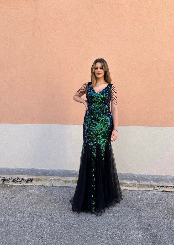 Abito a sirena con coda in tulle, full pailettes con cascata di pietre brillanti sulle braccia