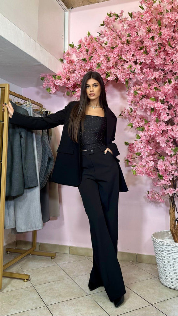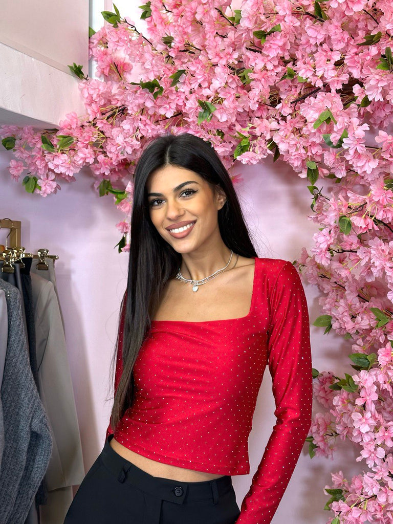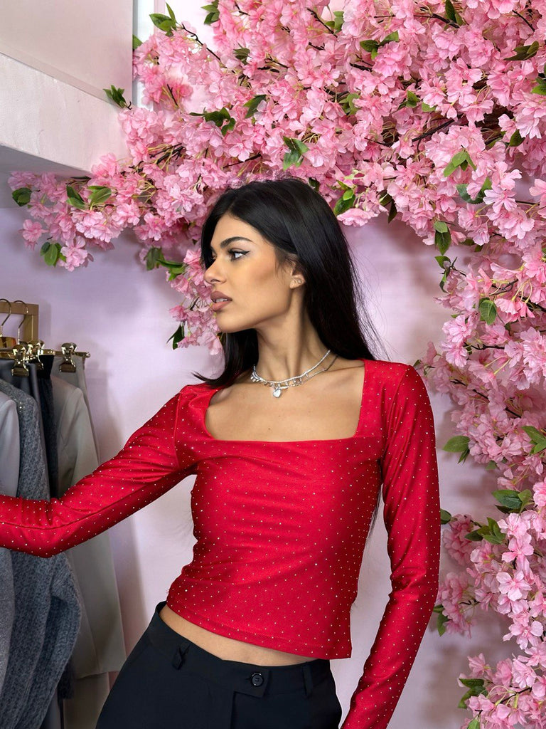Sotto giacca in lycra con scollatura quadrata, completamente ricoperto da micro strass